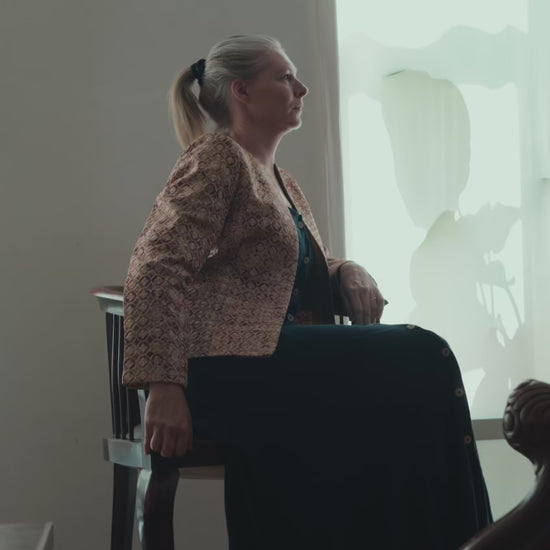 A collarless silhouette and clean front keep the structure modern, while the golden silk lining offers a soft contrast inside. Elegant without trying, bold without shouting — this is heritage, reimagined for today.