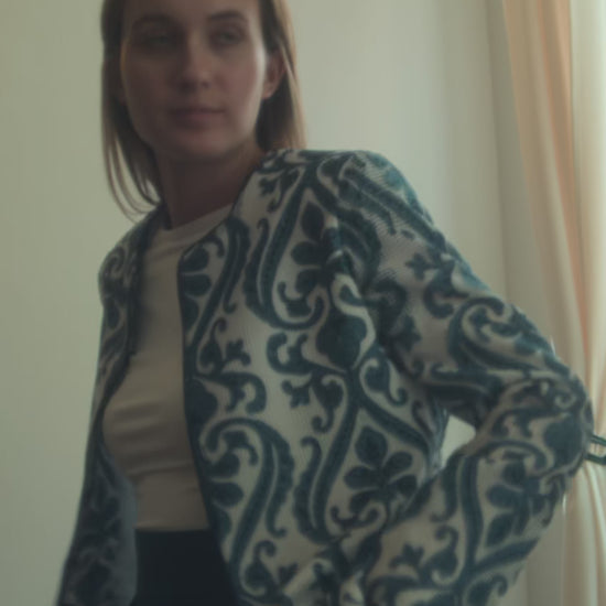 Crafted on a delicate netted base, this jacket feels as light as it looks. The intricate indigo vine motifs are embroidered and cut directly into the airy fabric, creating a layered effect that moves between structure and softness.